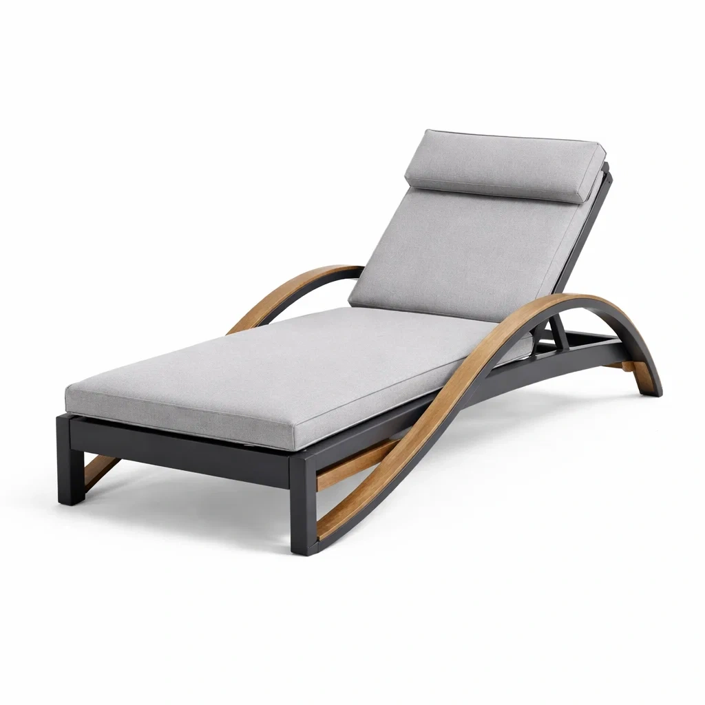 Chaise longue en aluminium et bois avec coussin gris