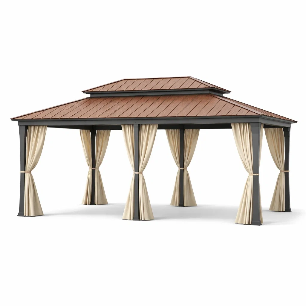 Pavillon rectangulaire en métal avec rideaux en polyester et toit en bois